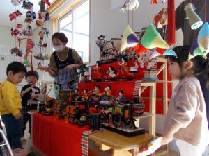 出来上がった作品と本物のひな飾りを見比べて、「あ、おんなじの(扇やしゃく)もってる」と発見したり、お話を聞いたりと季節の行事を見て聞いて楽しみました。