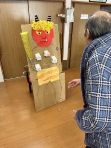 鬼が登場すると、最初は驚かれたご利用者様もいらっしゃいましたが、すぐに笑顔になり、豆を投げたり拍手をされたりと、終始和やかな雰囲気でした😊