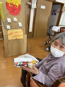 鬼が登場すると、最初は驚かれたご利用者様もいらっしゃいましたが、すぐに笑顔になり、豆を投げたり拍手をされたりと、終始和やかな雰囲気でした😊